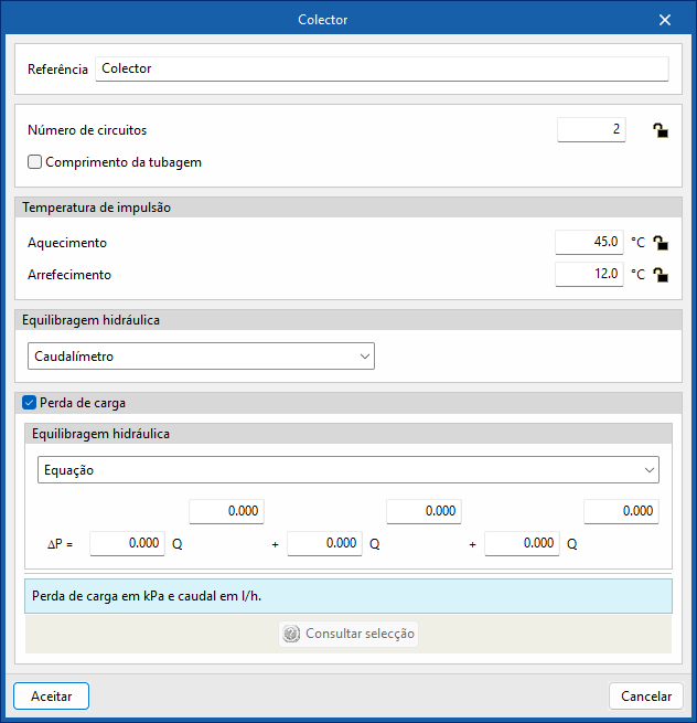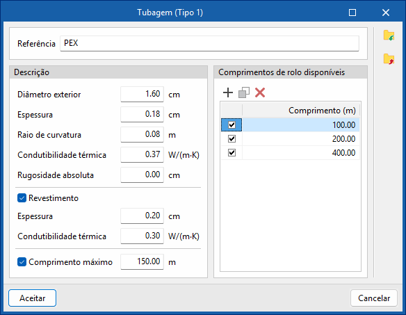 Ao introduzir a tubagem de ligação, o programa exige a definição dos seguintes parâmetros: