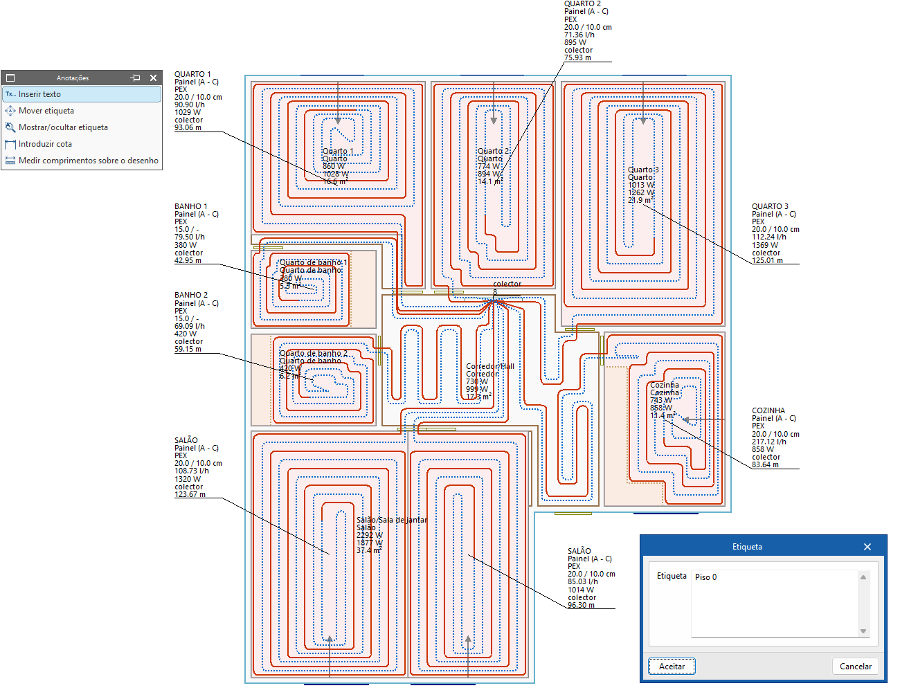 Seguidamente, é apresentado um exemplo de uma instalação de piso radiante que pode ser desenvolvida no programa, indicando a disposição dos elementos e as opções que permitem a sua introdução no modelo: