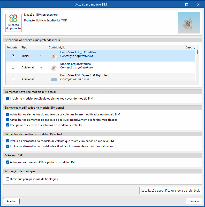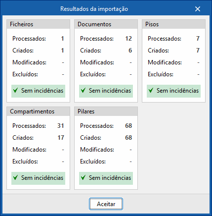 Atualiza as informações contidas nos modelos importados anteriormente para o projeto ou importa novos modelos, se desejado. A importação de plantas e compartimentos é realizada com o ficheiro marcado como "Iniciador".