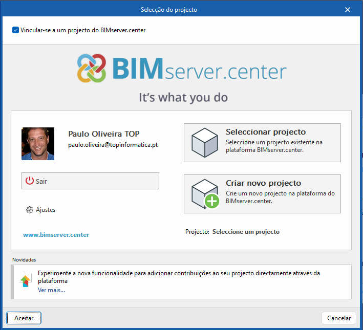 - Existe a opção de iniciar o projeto sem estar vinculado à plataforma BIMserver.center. Para isso, basta desmarcar a caixa "Vincular a um projeto do BIMserver.center", que se encontra na parte superior esquerda.