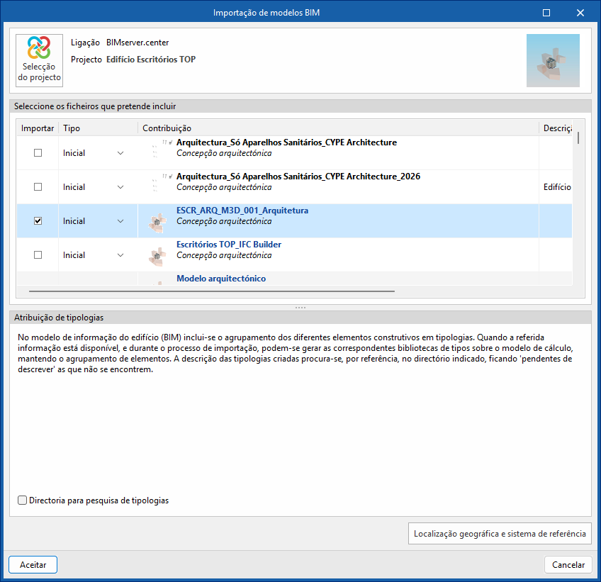 Ao criar um uma nova obra, se tiver sido selecionado um projeto alojado na plataforma BIMserver.center a partir de "Selecionar projeto", aparece a janela "Importação de modelos BIM", que mostra os ficheiros contidos nesse projeto em formato IFC.