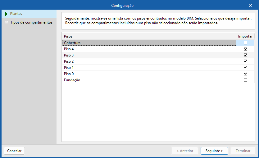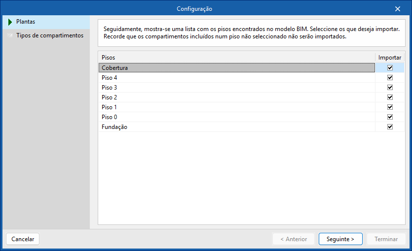 - No primeiro passo, é apresentado uma lista com as plantas encontradas no modelo BIM. Aqui é possível selecionar as plantas a importar. Os compartimentos incluídos numa planta não selecionada não serão importados.