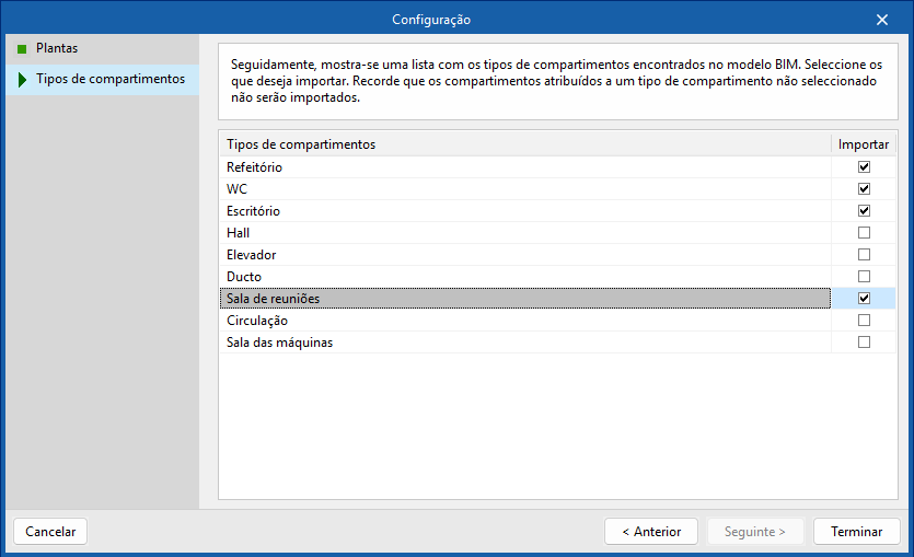 - No próximo passo, é apresentada uma lista com os tipos de compartimentos encontrados no modelo BIM. Aqui é possível selecionar os tipos de compartimentos a importar. Os compartimentos atribuídos a um tipo de compartimento não selecionado não serão importados.