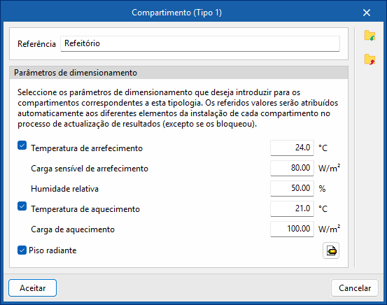 - Compartimento (Referência, Tipo, Carga térmica sensível de arrefecimento, Carga térmica de aquecimento, Área, Legenda)