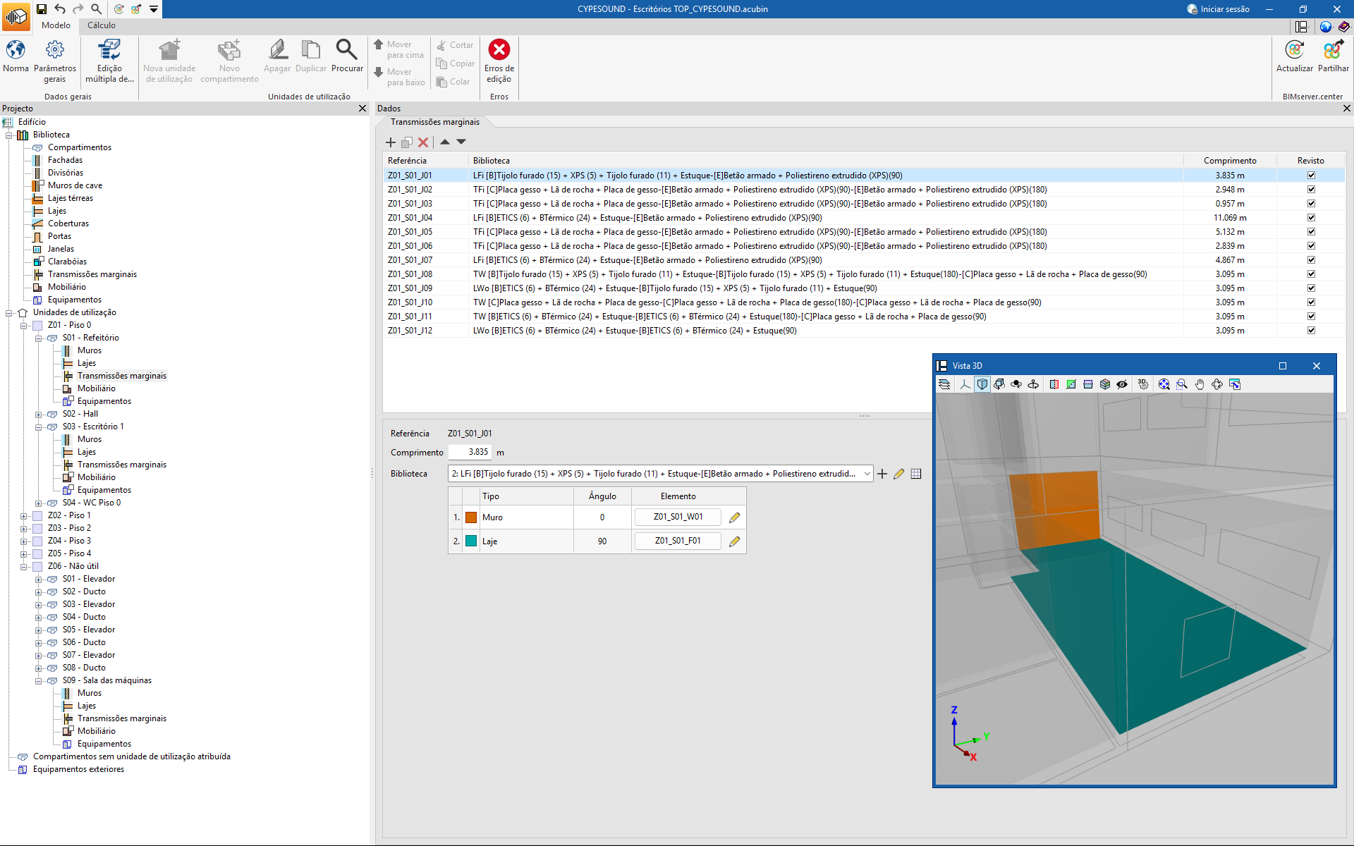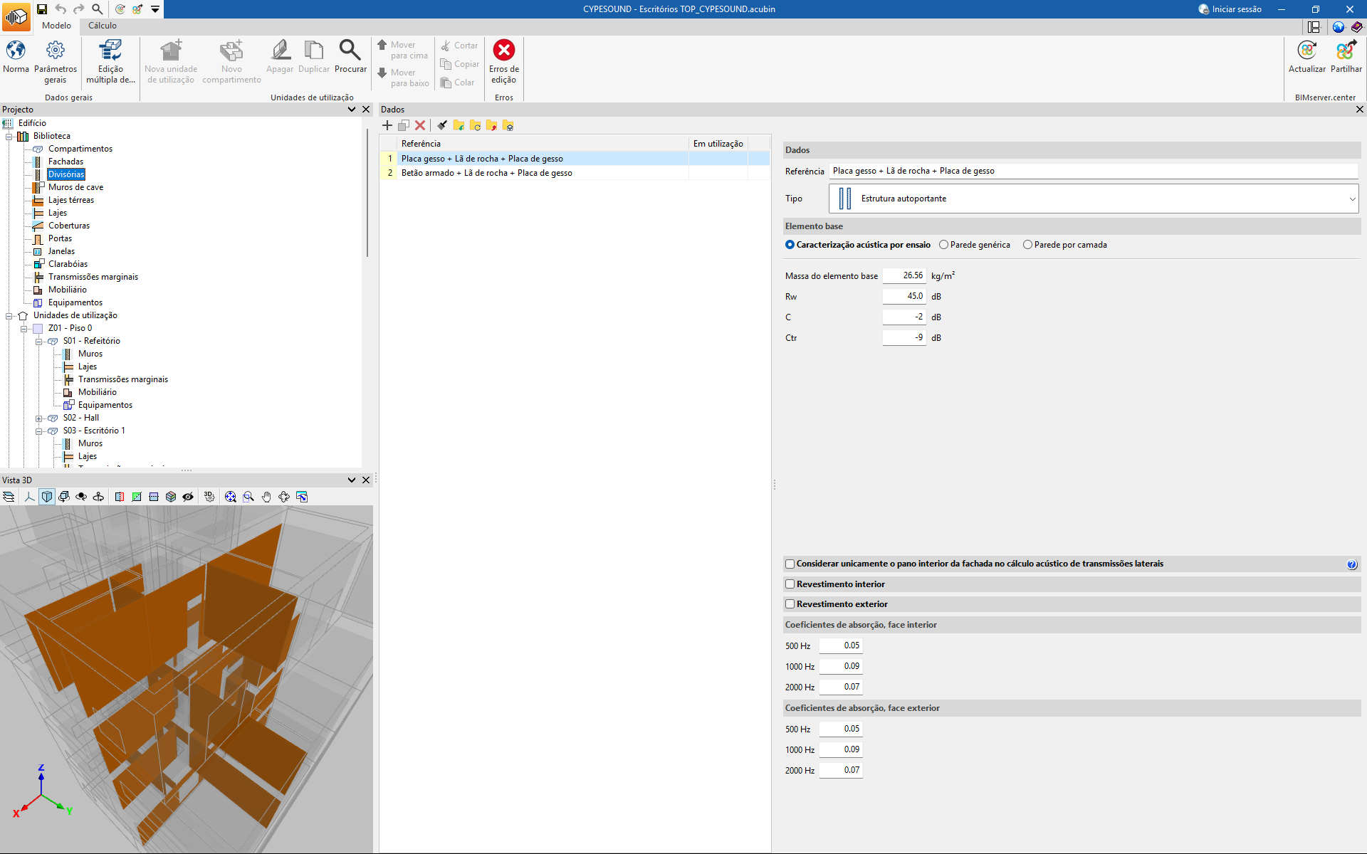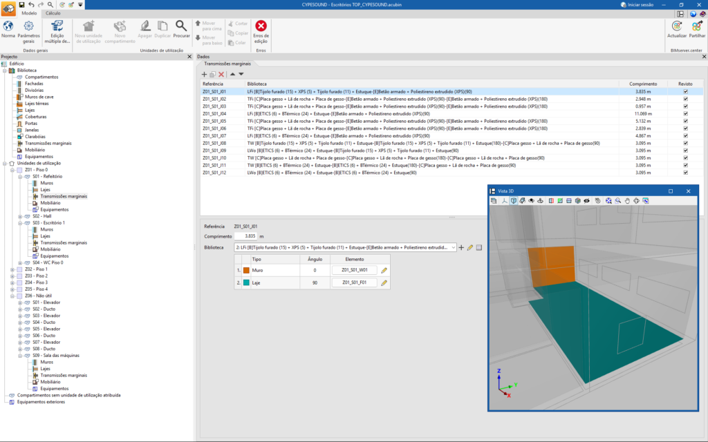 Do lado esquerdo, encontram-se as principais ferramentas de definição do projeto, como as bibliotecas de tipologias. Estas definem todas as classes de elementos, incluindo a sua caraterização acústica, a aplicar posteriormente a cada um dos componentes do edifício.