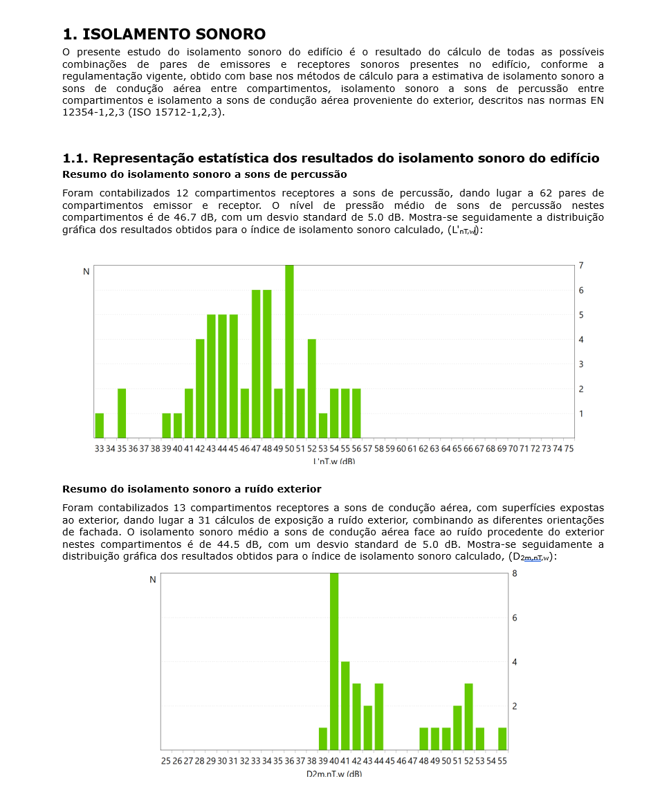 No caso de utilização de normas personalizadas, é incluída uma representação estatística dos resultados obtidos, um quadro com os resultados mais desfavoráveis e a sua justificação, tanto para o ruído aéreo e de impacto entre compartimentos como para o ruído aéreo exterior.