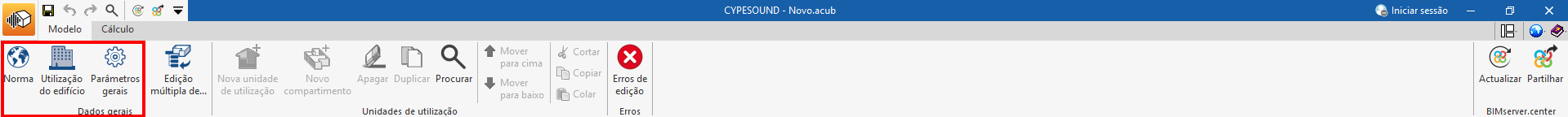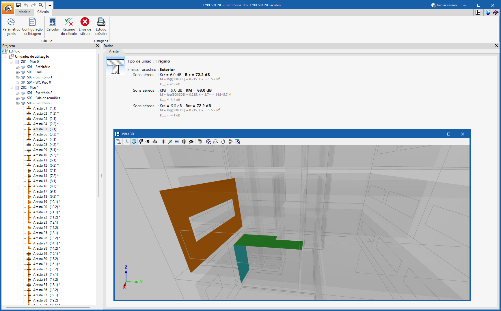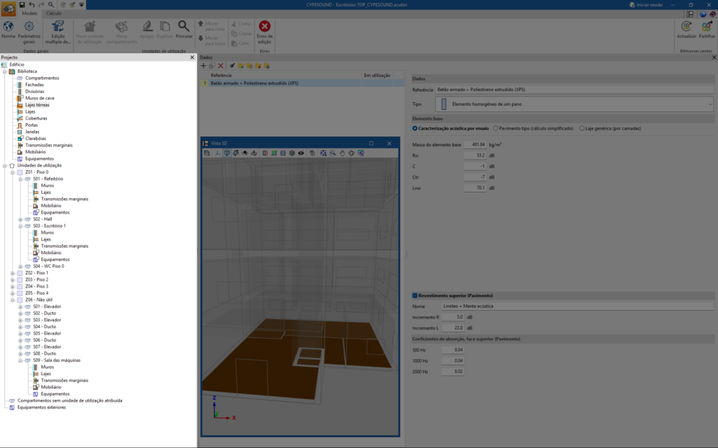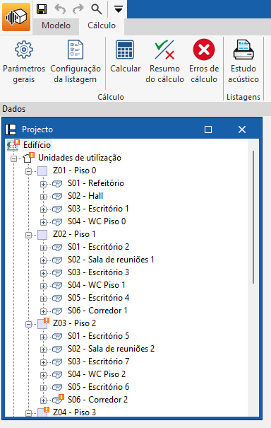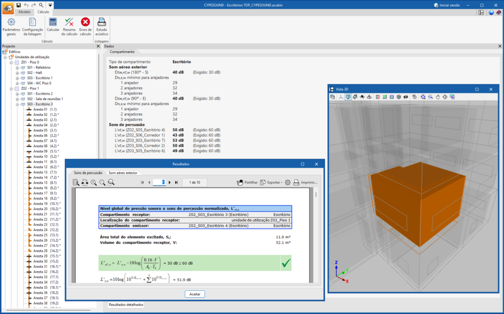 - Cálculo acústico do edifício (bloco "Cálculo", "Calcular").