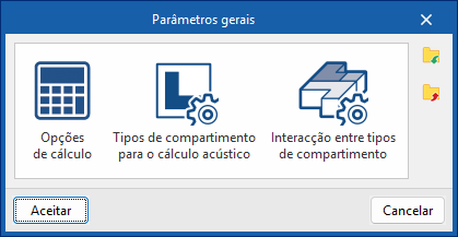 Se for selecionada uma norma personalizada, nos parâmetros gerais de cálculo devem ser definidas as magnitudes dos parâmetros que caracterizam o comportamento acústico do edifício e os respetivos valores mínimos exigidos.