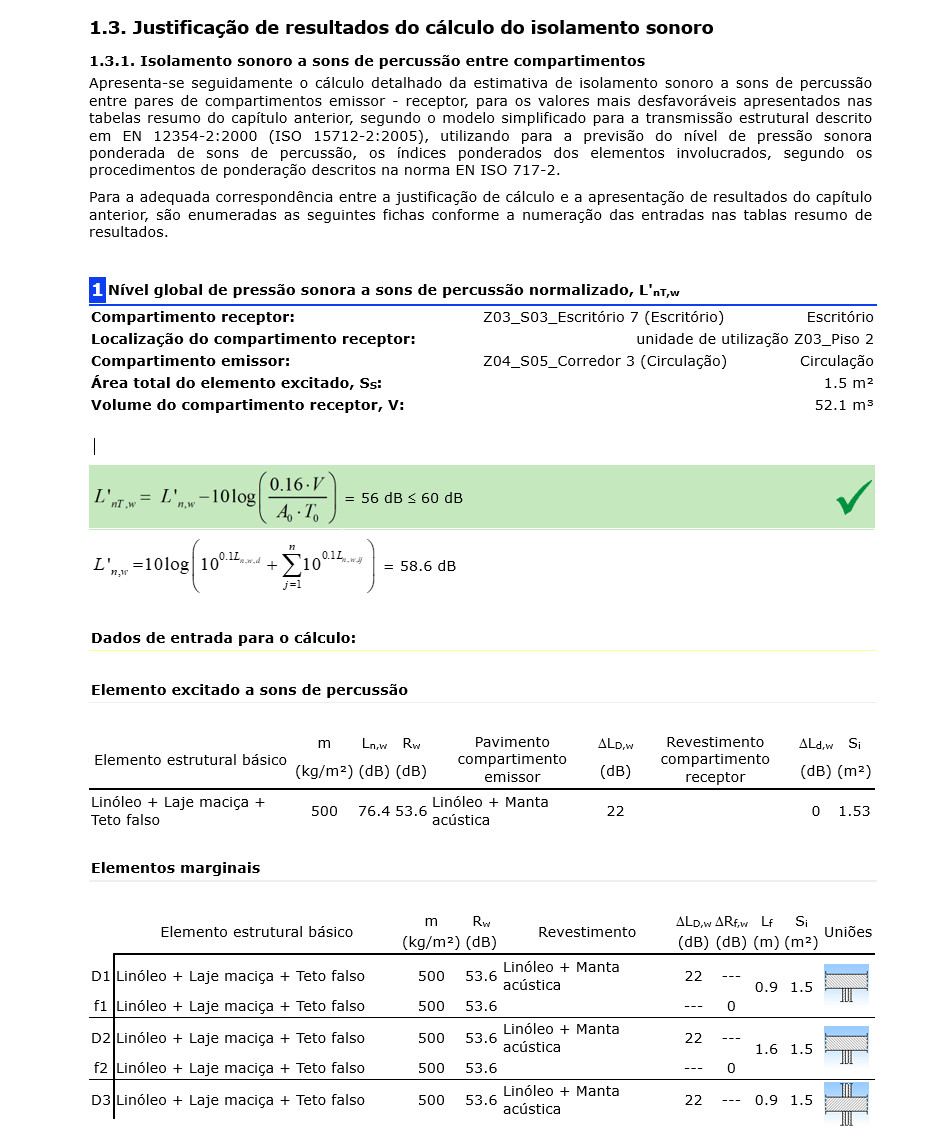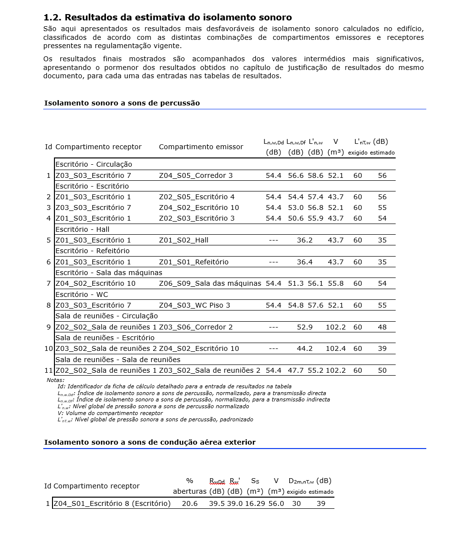 Para cada compartimento, é possível gerar uma listagem de resultados detalhados. Esta listagem inclui diferentes separadores com a descrição dos dados e o processo seguido no cálculo do isolamento sujeito ao ruído aéreo interior e exterior, ao ruído de impacto, da reverberação e do ruído do equipamento.