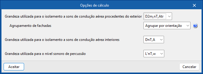 Nas opções de cálculo, seleciona as magnitudes que pretende utilizar para avaliar cada tipo de isolamento e o nível de ruído de impacto.