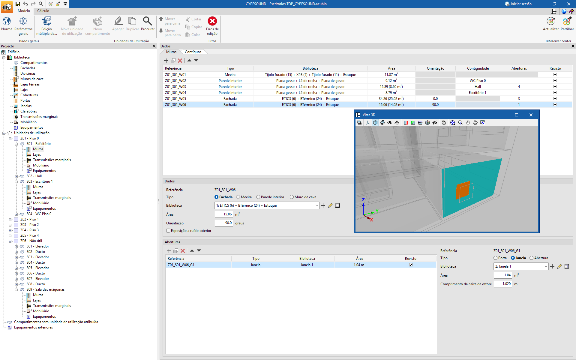 O navegador do projeto está situado no lado esquerdo. O programa dispõe de uma biblioteca de tipologias na qual se definem todas as classes de elementos, incluindo a sua caraterização acústica, para serem posteriormente aplicadas a cada um dos componentes do edifício.