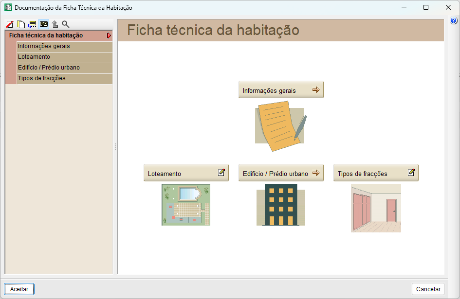 Para introduzir os dados necessários à obtenção da documentação da Ficha técnica da habitação, deve aceder à opção «Documentação da Ficha técnica da habitação» no menu «Mostrar». Na janela que surge, é possível introduzir os dados técnicos e administrativos do edifício. A janela de diálogo está organizada em duas partes principais: