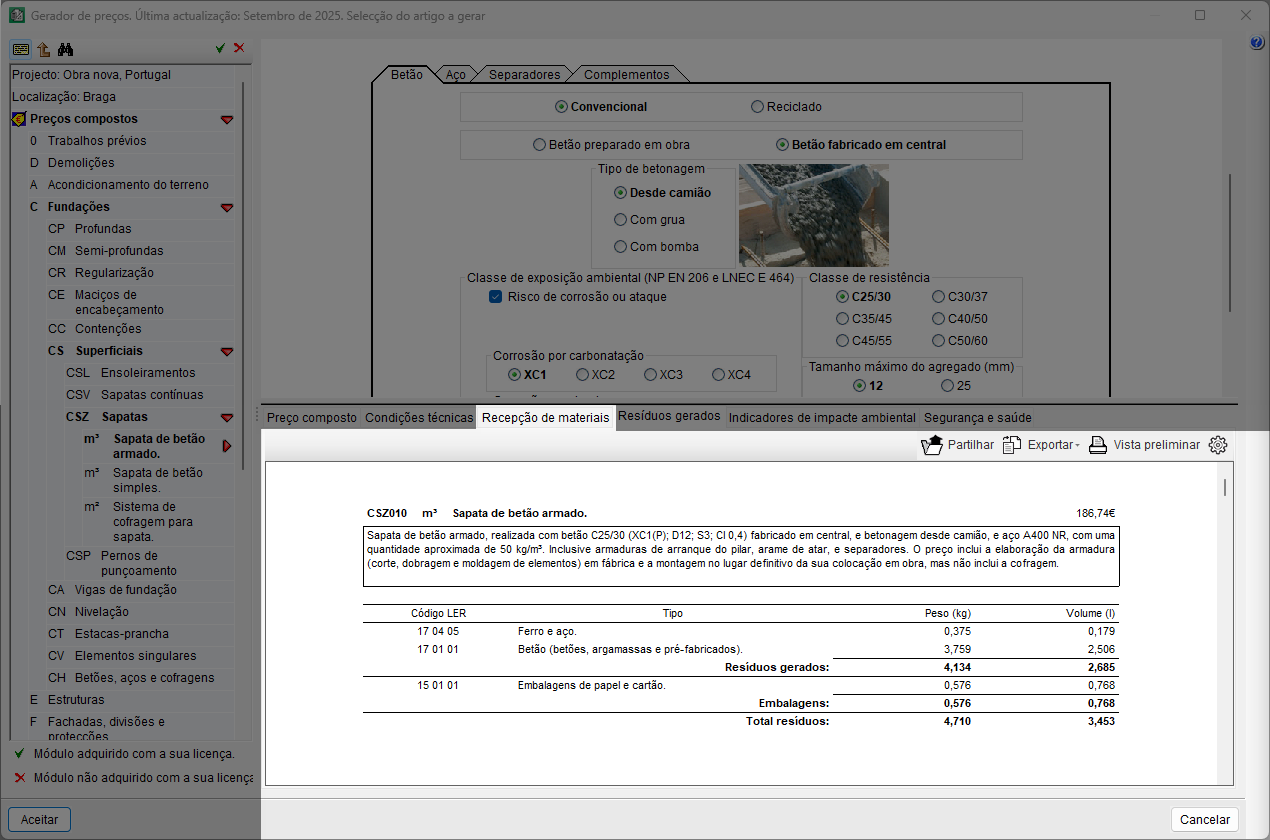 O Gerador de Preços inclui, em todas as unidades de obra que possam produzir resíduos, uma discriminação dos resíduos gerados, que pode ser visualizada no separador “Resíduos gerados".