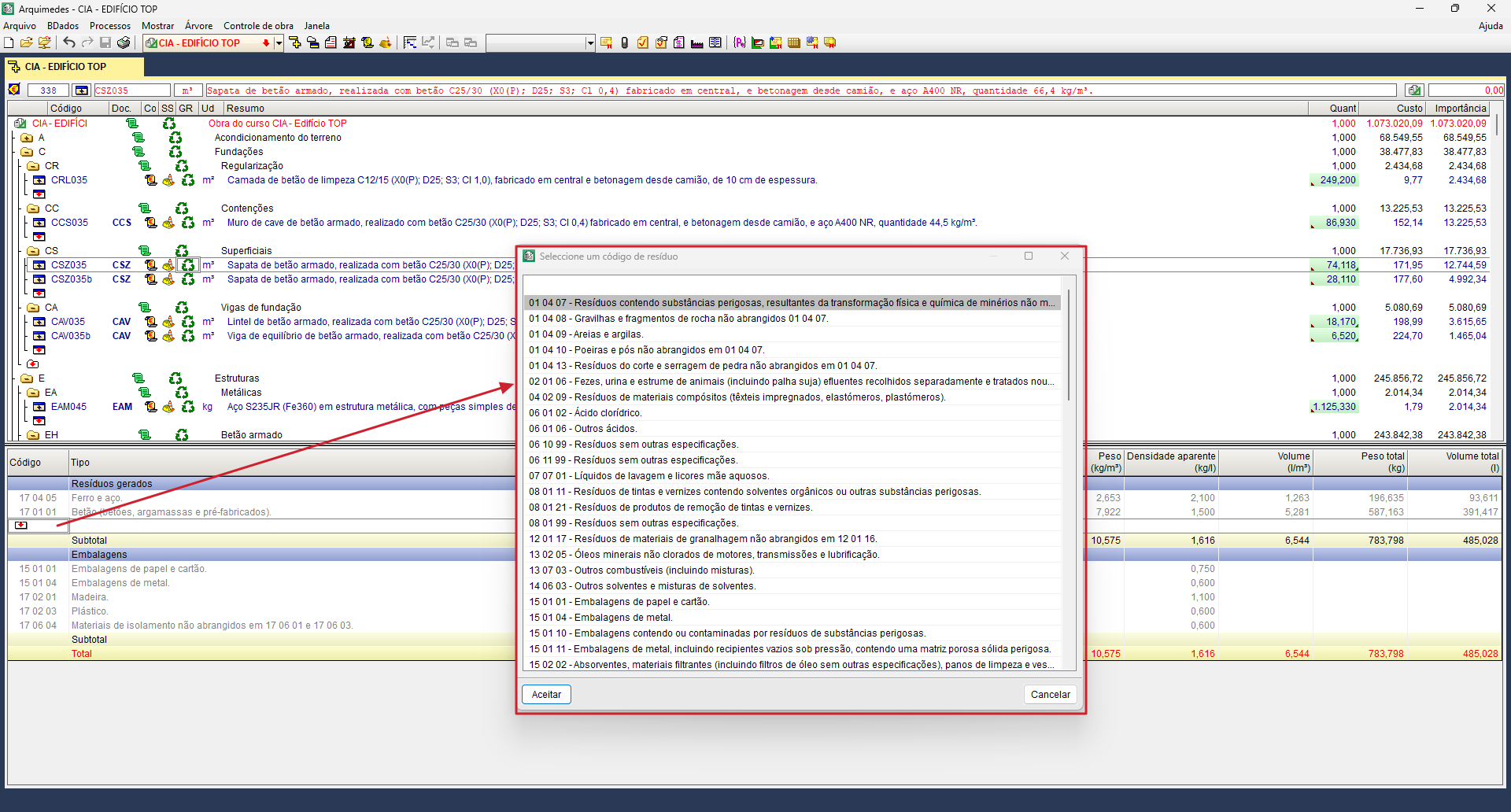 Quando as unidades de obra provenientes do Gerador de preços, são copiadas para o Arquimedes, a informação sobre a Gestão de resíduos é incluída automaticamente, se assim tiver sido configurado no diálogo "Dados adicionais" do Arquimedes.