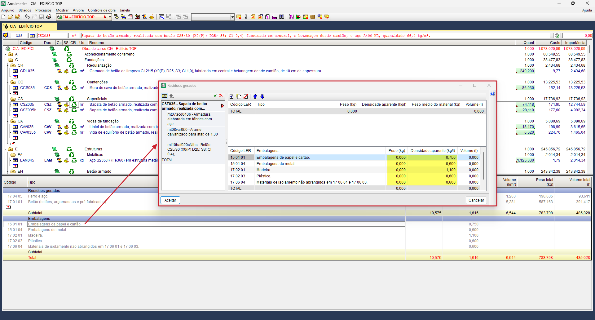 Nas tabelas de composição aparecem sempre todos os tipos de resíduos provenientes de embalagens, mesmo que a rubrica selecionada não os gere. Os dados podem ser alterados pelo utilizador clicando duas vezes com o rato no item correspondente da tabela de composição. Será aberta a janela de diálogo "Resíduos gerados", permitindo introduzir o peso e a densidade aparente.