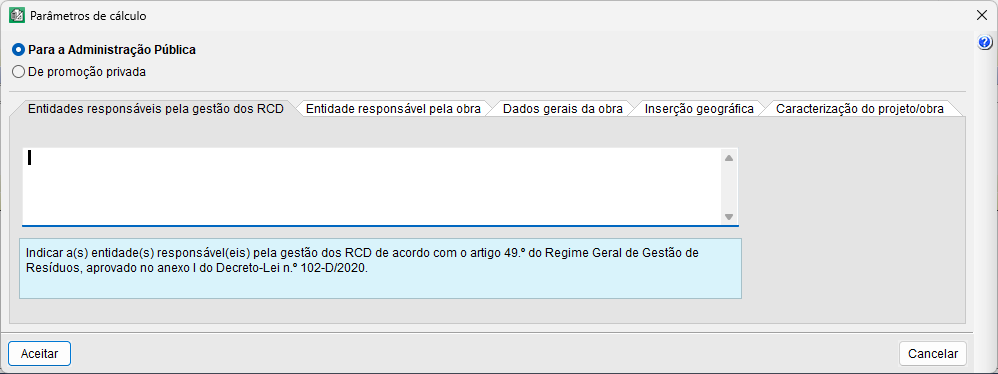 - No caso de obras para a Administração Pública, devem ser introduzidos os dados relativos à(s) entidade(s) responsável(is) pela gestão dos resíduos de construção e demolição (RCD), à entidade responsável pela obra, aos dados gerais da obra, à sua localização geográfica e à descrição resumida do projeto/obra a realizar. Também neste caso, as operações de valorização (R) e eliminação (D) são atribuídas automaticamente em função do tipo de resíduo, em conformidade com a Decisão 2014/955/UE. Aconselha-se o utilizador a rever o documento gerado para ter conhecimento das opções escolhidas pelo programa.