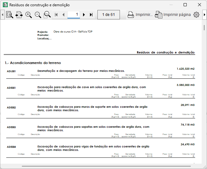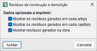 A documentação sobre gestão de resíduos pode ser complementada com a listagem correspondente ao modelo “pl_residuos01.pla”. A impressão da listagem está disponível através da opção “Imprimir listagem” na secção “Imprimir” do menu “Arquivo”, dentro do tipo “Resíduos”. Antes da impressão, é possível escolher se os resíduos gerados em cada unidade de obra, em cada capítulo e/ou na obra devem ser apresentados.