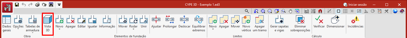 A opção "Vista 3D", no bloco "Obra" da barra de ferramentas superior do separador "Fundação", permite obter uma vista tridimensional detalhada do modelo, incluindo a fundação, numa janela separada.