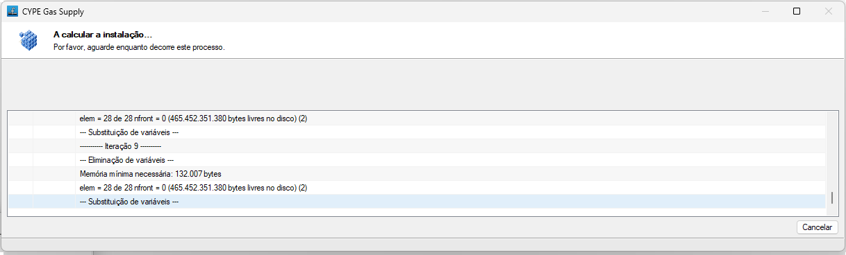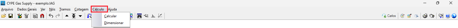No menu "Cálculo" na parte superior da interface do programa encontram-se as opções para efetuar o cálculo, verificações e dimensionamento da instalação.