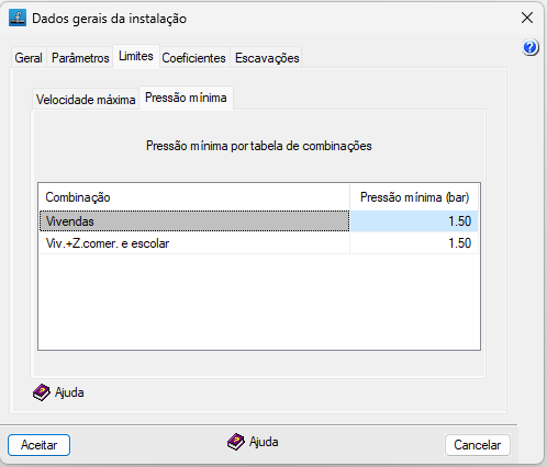 Em cada entrada, define-se o limite de velocidade ou de presão para cada combinação definida nos "Dados gerais", "Editar combinações". - Em função do 'Diâmetro' (tabela) (para a "Velocidade máxima")