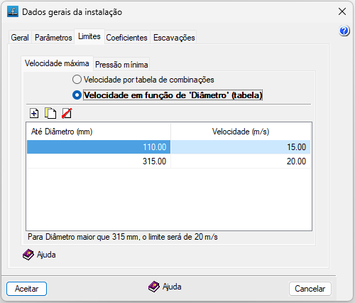 Em cada entrada define-se o limite de velocidade aplicado às tubagens com diâmetros iguais ou inferiores ao indicado. Para diâmetros superiores aos indicados, aplica-se o limite do maior diâmetro da tabela.