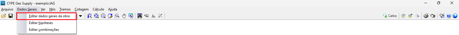No menu "Dados gerais" na parte superior, encontra-se a opção "Editar dados gerais da obra", que permite introduzir dados gerais da instalação, tais como materiais e terrenos, parâmetros, limites e coeficientes utilizados no cálculo ou dados de escavação.