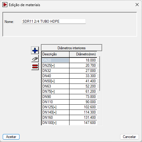 - A lista à esquerda representa os “Materiais da obra”. É possível criar um material manualmente com as ferramentas localizadas à esquerda ou importá-lo a partir dos materiais da biblioteca. Ao adicionar ou editar um material da obra, indica-se o “Nome” e a série de “Diâmetros interiores” associados.