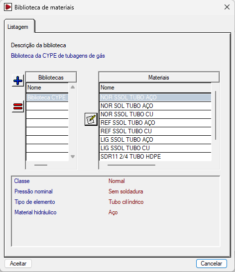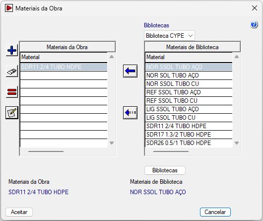 Ao clicar no botão "Materiais", é possível gerir os materiais das condutas da obra, bem como as bibliotecas de materiais disponíveis. Na janela que aparece, são apresentadas duas listas: