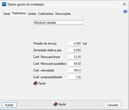 Permite definir os seguintes parâmetros da instalação de abastecimento de gás: