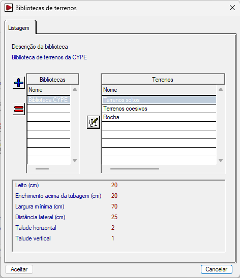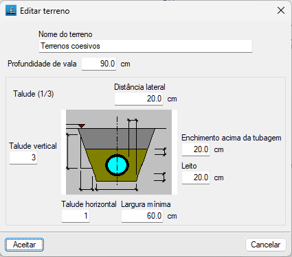 - A lista à esquerda representa os “Terrenos da obra”. É possível criar um terreno manualmente com as ferramentas localizadas à esquerda ou importá-lo a partir dos terrenos de biblioteca. Ao adicionar ou editar um terreno da obra, indica-se o "Nome do terreno", e os seguintes parâmetros geométricos: "Profundidade da vala" "Distância lateral", "Enchimento acima da tubagem", "Leito", "Largura mínima", "Talude vertical" e "Talude horizontal" (que formam a relação de "Talude" apresentada ao lado da imagem).