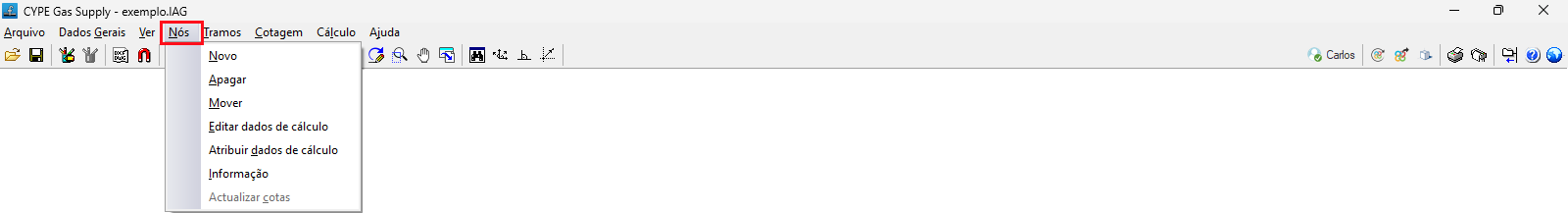 No menu "Nós", na parte superior da interface do programa, encontram-se as seguintes opções relacionadas com a introdução e edição dos nós da instalação.