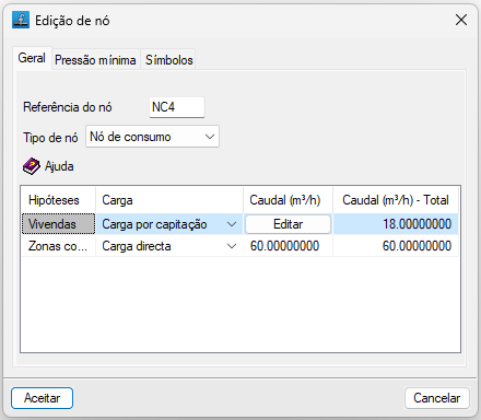 Os nós são criados por defeito como nós de transição, ou seja, nós sem consumo que permitem realizar mudanças de direção mantendo a unidade do tramo no dimensionamento. Posteriormente, podem ser editados em "Nós", "Editar dados de cálculo". Se, ao introduzir um novo nó, clicar com o botão direito do rato, também é possível aceder ao painel de edição dos dados de cálculo do nó que está a ser introduzido.
