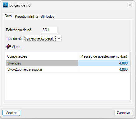 Ponto de abastecimento da instalação. O programa permite definir um único abastecimento ou vários abastecimentos para a rede. Ao selecionar este tipo de nó, o programa apresenta uma tabela na parte inferior que permite definir o valor da pressão disponível para cada combinação na coluna "Pressão de abastecimento". Desta forma, é possível simular diferentes condições de funcionamento da instalação para diferentes pressões de abastecimento. - Nó de transição