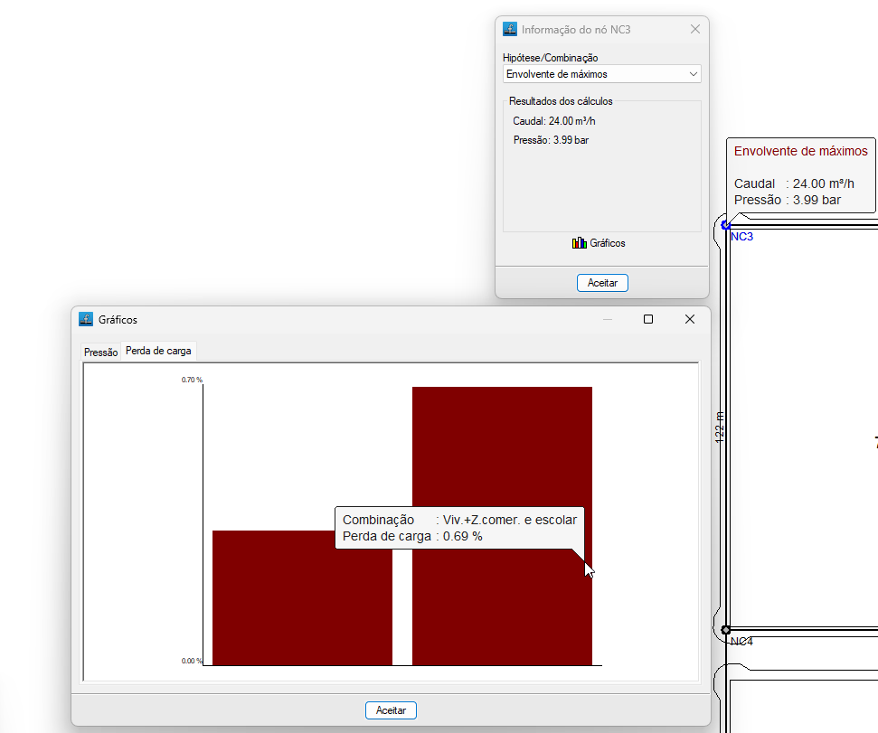 Se a obra estiver calculada, obtêm-se também os resultados do cálculo do nó na combinação ativada nesse momento. Além disso, ao clicar no nó, abre-se uma janela onde é possível consultar os resultados para qualquer hipótese, combinação, envolvente e oscilação, tanto de forma analítica como gráfica: através do botão "Gráficos" são visualizados os gráficos de "Pressão" e de "Perda de carga" para as diferentes combinações.