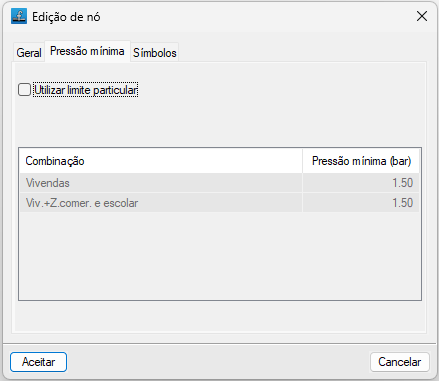 Permite introduzir limites particulares de pressão mínima para o nó que está a ser editado, para cada uma das combinações de hipóteses apresentadas na tabela.- Utilizar limite particular (opcional)