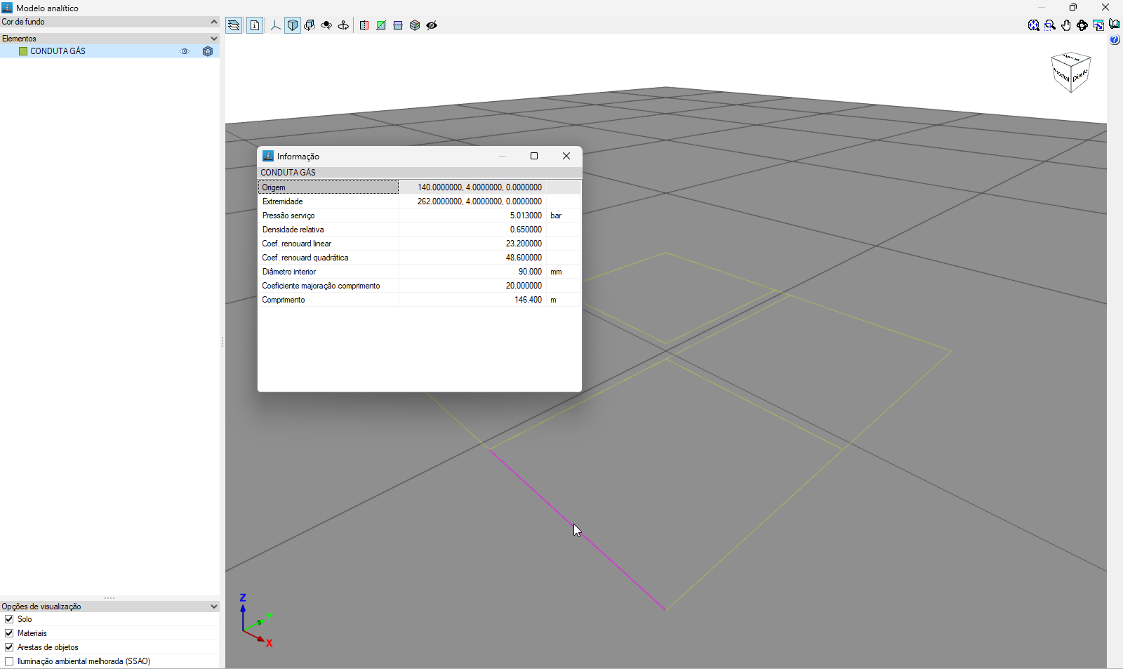 Depois de calculada a obra, esta opção permite abrir uma janela com a representação da instalação em 3D. Além disso, é possível verificar as características geométricas de cada tramo utilizando a opção "Informação" e clicando no tramo.