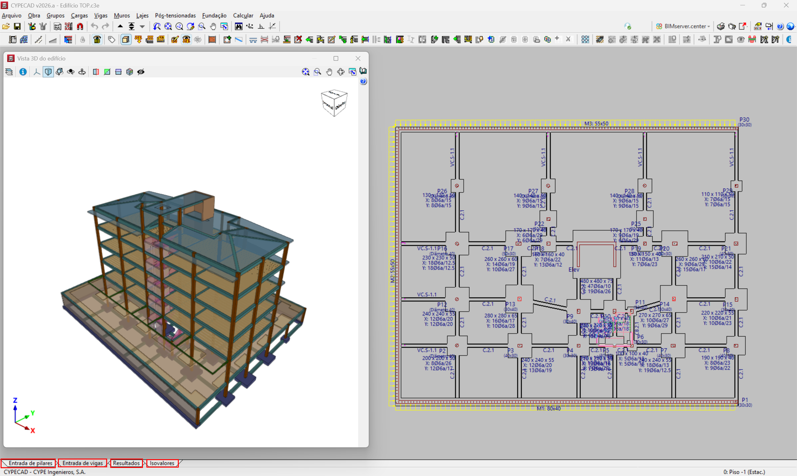 A interface do CYPECAD foi concebida para oferecer um ambiente de trabalho estruturado e eficiente, dividido em várias guias principais localizadas na parte inferior esquerda da interface: "Entrada de pilares", "Entrada de vigas", "Resultados" e "Isovalores". Cada separador tem na parte superior uma linha de menus suspensos, que podem ser comuns ou específicos de cada separador.