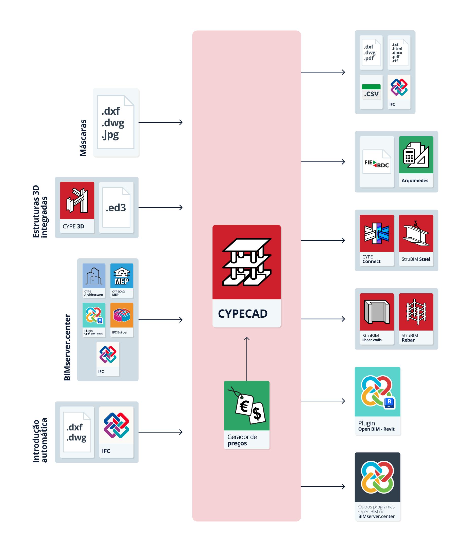 - Importação do modelo com a geometria de um edifício. Isto permite gerar as plantas, os pilares, os muros, as vigas e o contorno das lajes, bem como gerar os elementos construtivos (incluindo as suas cargas), a partir de elementos encontrados no modelo BIM, como pilares, vigas, lajes ou muros e divisórias. A estrutura poderá ser calculada com base na geometria importada dos elementos mencionados, após a sua conclusão no CYPECAD. Os modelos podem provir de diversas fontes: