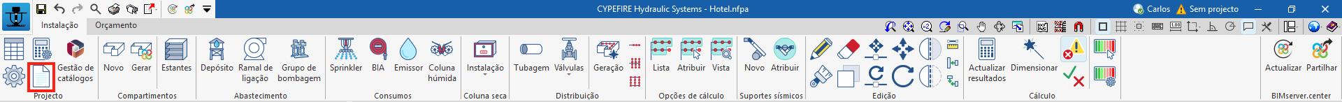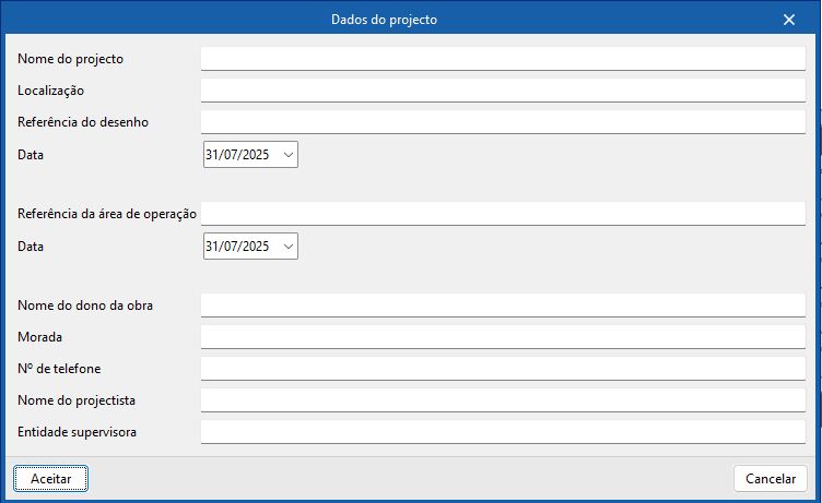 Dentro do separador "Instalação", no grupo "Projeto" da barra de ferramentas principal, encontra-se a opção para introduzir os dados do projeto: