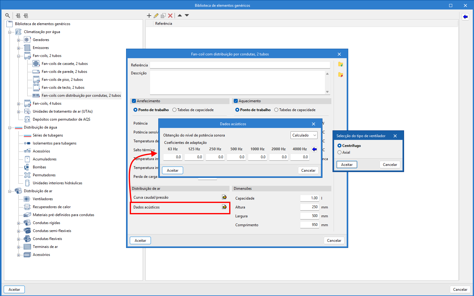 A introdução de dados acústicos em equipamentos genéricos é feita acedendo ao painel de edição na "Biblioteca de elementos genéricos" e premindo na opção disponível ao lado da etiqueta "Dados acústicos" (ou "Dados acústicos (Impulsão)" e "Dados acústicos (Retorno/Extração)" em equipamentos com duas redes associadas).