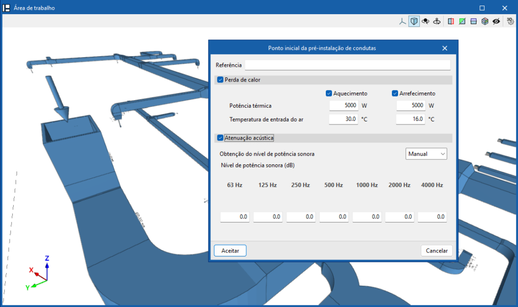 No caso de pré-instalações de condutas sem equipamentos introduzidos, são ativadas as caixas “Perda de calor” e “Atenuação acústica”, dentro da janela de edição do “Ponto inicial da pré-instalação de condutas”.