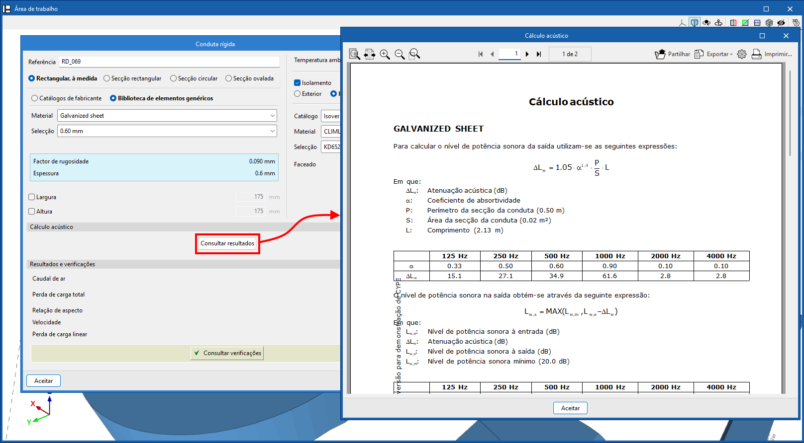Ativação do cálculo térmico e acústico em condutas