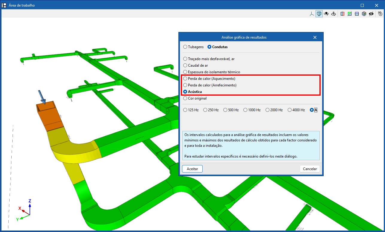 Também é possível visualizar os resultados de forma gráfica, colorindo os tramos da conduta no modelo através da “Análise gráfica dos resultados”, selecionando as opções “Perda de calor (Aquecimento)”, “Perda de calor (Arrefecimento)” ou “Acústica” na sua configuração.