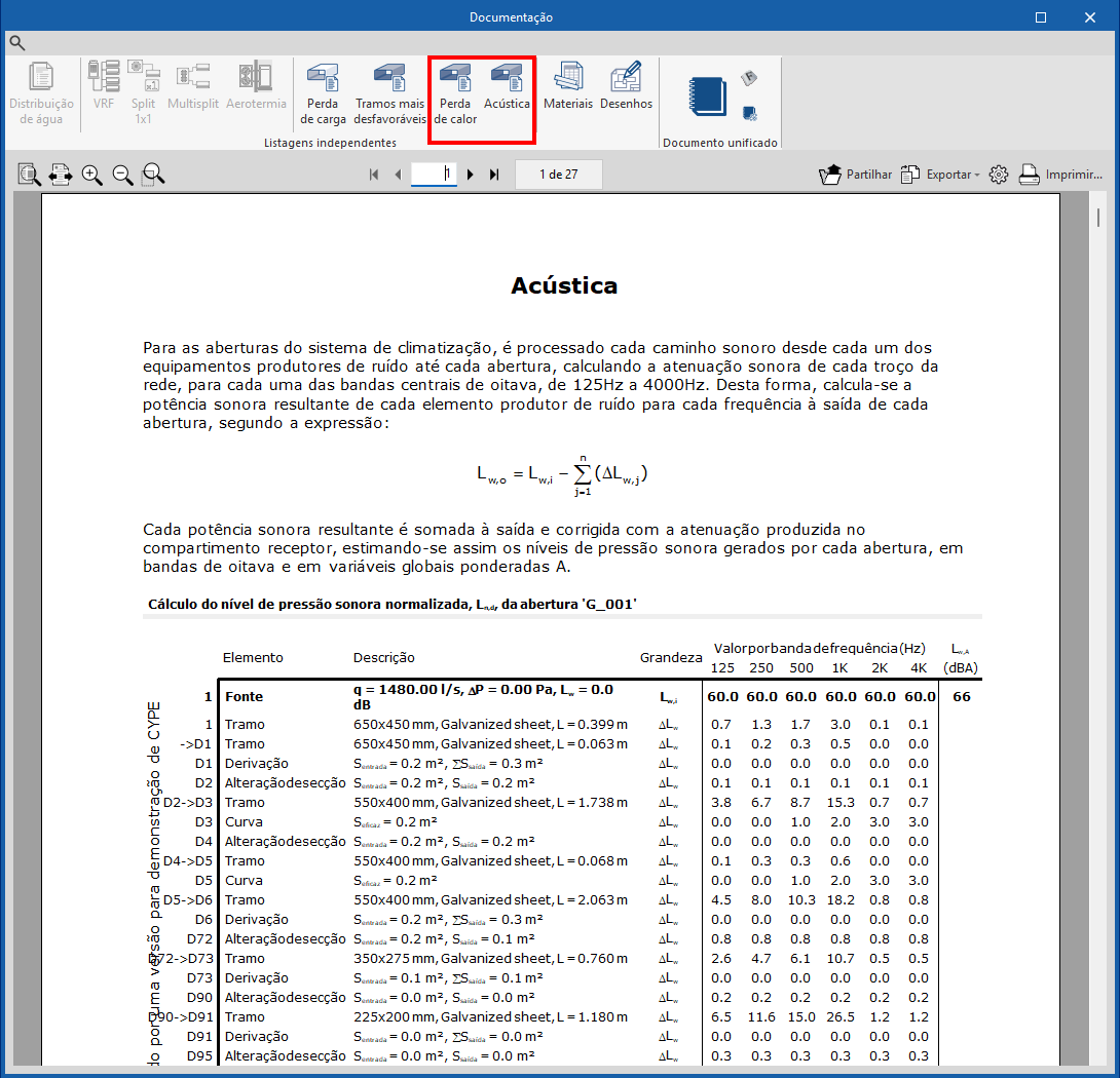 O programa permite consultar as listagens de resultados do cálculo acústico a partir do painel de edição de cada equipamento ou tramo de conduta, na secção “Cálculo acústico”, premindo em seguida em “Consultar resultados”.
