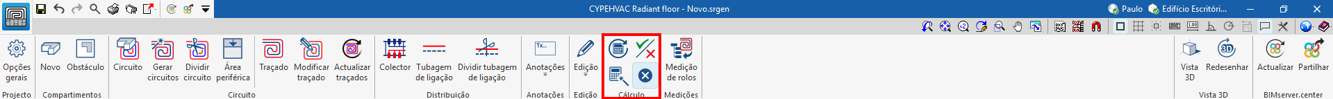 No bloco "Cálculo" da barra de ferramentas principal, encontram-se as opções para realizar o cálculo, a verificação e o dimensionamento dos elementos do modelo de acordo com os requisitos configurados pelo utilizador: