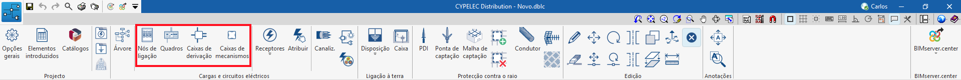No grupo "Cargas e circuitos elétricos" da barra de ferramentas principal podem ser definidos e introduzidos os nós de ligação, os quadros, as caixas de derivação e as caixas de mecanismos: