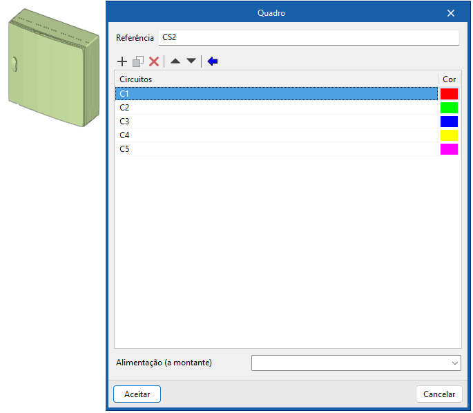 Permite definir a lista de circuitos atribuídos ao quadro geral ou parcial. Em cada um deles é introduzida a seguinte informação:- Referência