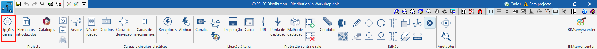 No grupo "Projeto" da barra de ferramentas principal, encontra-se a opção para configurar as opções gerais da obra: