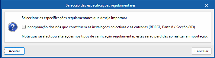 As opções do lado direito permitem-lhe selecionar e importar uma das seguintes especificações regulamentares. Se tiverem sido efetuadas alterações aos tipo de verificação, estas perder-se-ão ao realizar a importação.