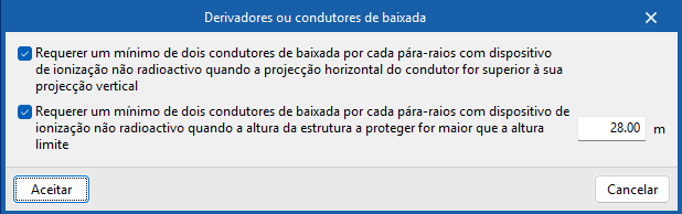 Permite configurar os seguintes requisitos para o número mínimo de derivadores ou condutores de baixada de uma instalação de proteção contra o raio: